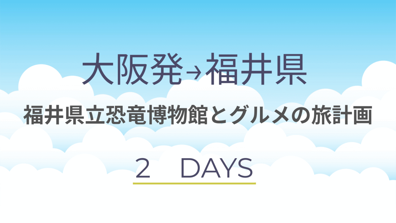 みなさん、こんにちは!今回は大阪発⇒福井県【1泊2日】福井県立恐竜博物館とグルメの旅計画をお届けします。大阪から車・電車で3時間ほどで行ける距離も行きやすいですね。今回は1泊2日でギュギュっと凝縮した旅計画をお届けしようかと思います。